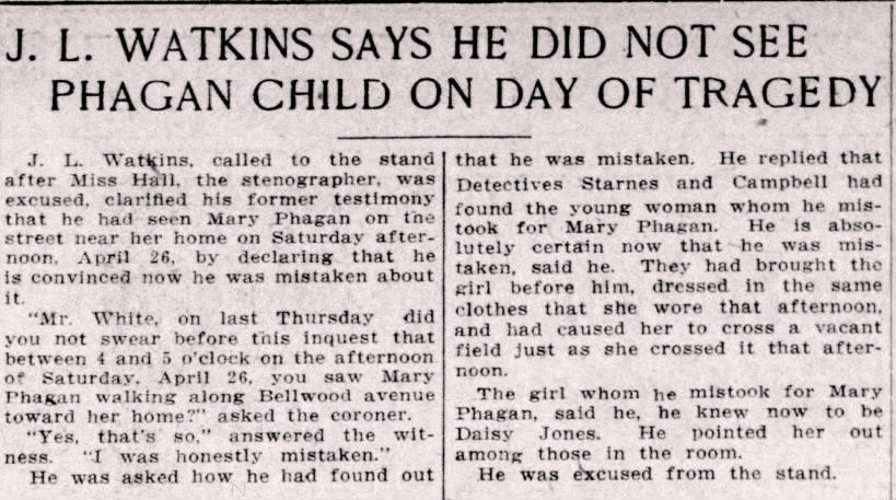 J. L. Watkins, called to the stand after Miss Hall, the stenographer, was excused, clarified his former testimony that he had seen Mary Phagan on the street near her home on Saturday afternoon, April 26, by declaring that he is convinced now he was mistaken about it.