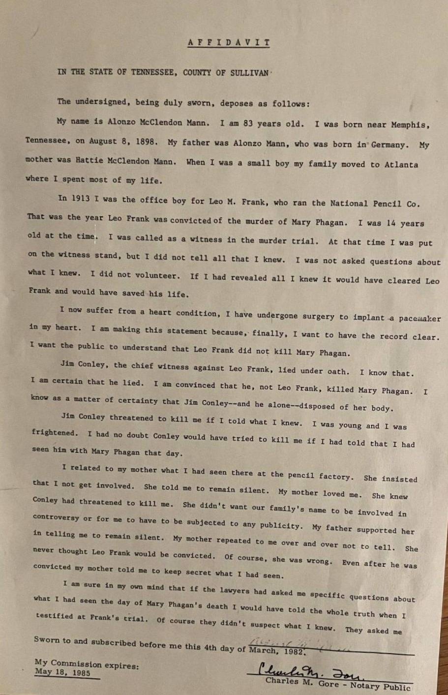 I now suffer from a heart condition, I have undergone surgery to implant a pacemaker in my heart. I am making this statement because, finally, I want to have the record clear. I want the public to understand that Leo Frank did not kill Mary Phagan.
