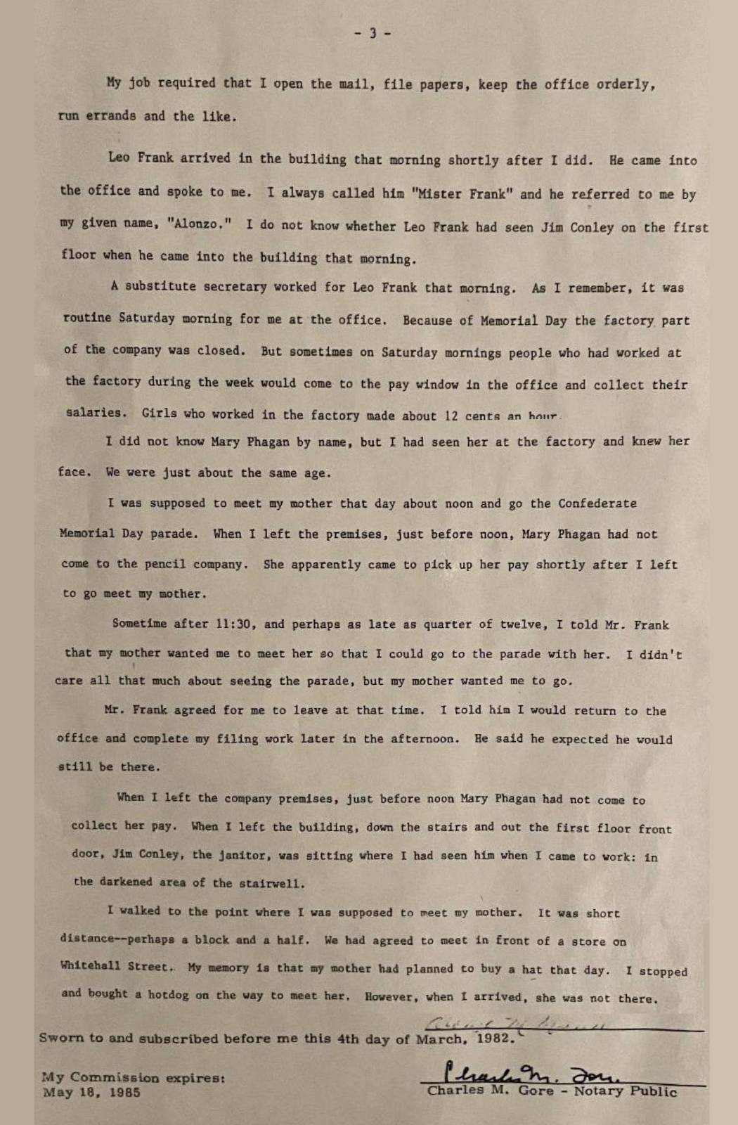 A substitute secretary worked for Leo Frank that morning. As I remember, it was [a] routine Saturday morning for me at the office. Because of Memorial Day the factory part of the company was closed. But sometimes on Saturday mornings people who had worked at the factory during the week would come to the pay window in the office and collect their salaries. Girls who worked in the factory made about 12 cents an hour.