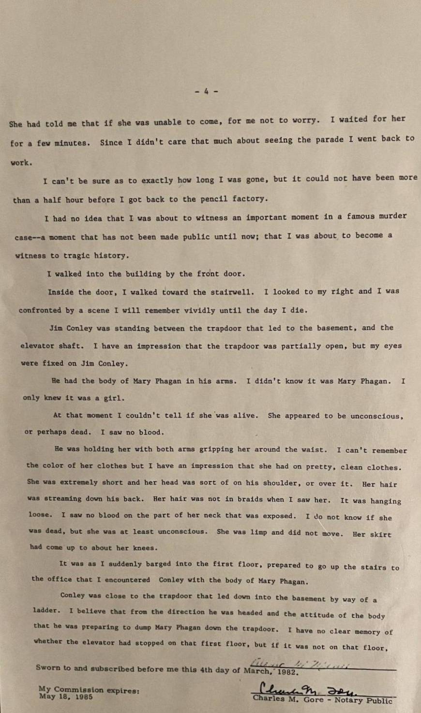 Conley was close to the trapdoor that led down into the basement by way of a ladder. I believe that from the direction he was headed and the attitude of the body that he was preparing to dump Mary Phagan down the trapdoor. I have no clear memory of whether the elevator stopped on that first floor, but if it was not on that floor.
