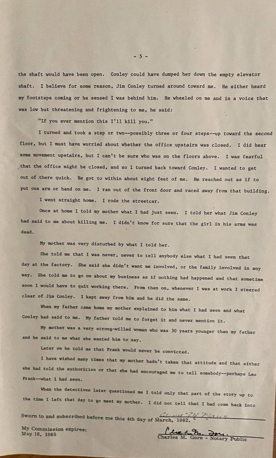 She told me that I was never, never to tell anybody else what I had seen that day at the factory. She said she didn't want me involved, or the family involved in any way. She told me to go on about my business as if nothing had happened and that sometime soon I would have to quit working there. From then on, whenever I was at work I steered clear of Jim Conley. I kept away from him and he did the same.