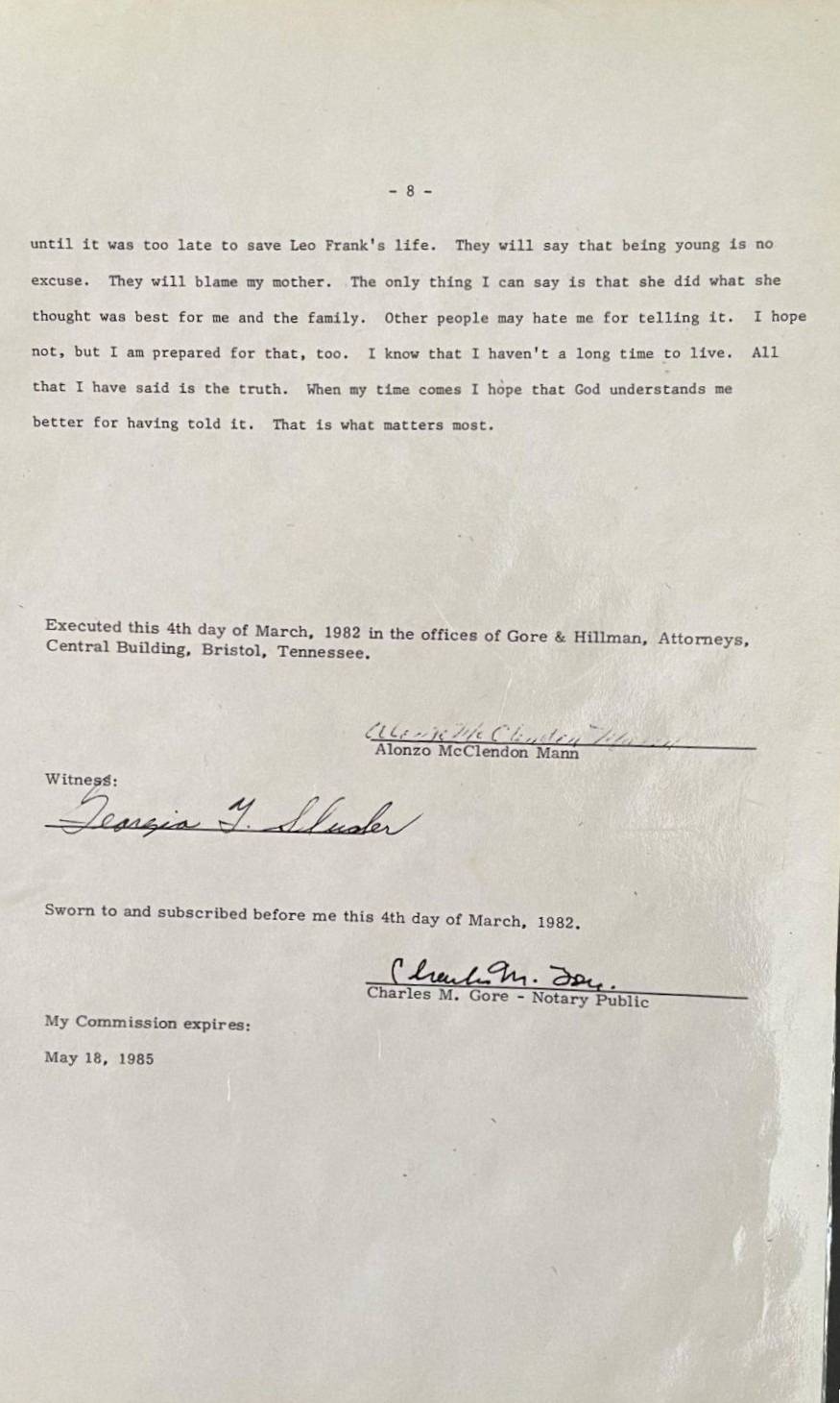 until it was too late to save Leo Frank's life. They will say that being young is no excuse. They will blame my mother. The only thing I can say is that she did what she thought was best for me and the family. Other people may hate me for telling it. I hope not, but I am prepared for that, too. I know that I haven't a long time to live. All that I have said is the truth. When my time comes I hope that God understands me better for having told it. That is what matters most.