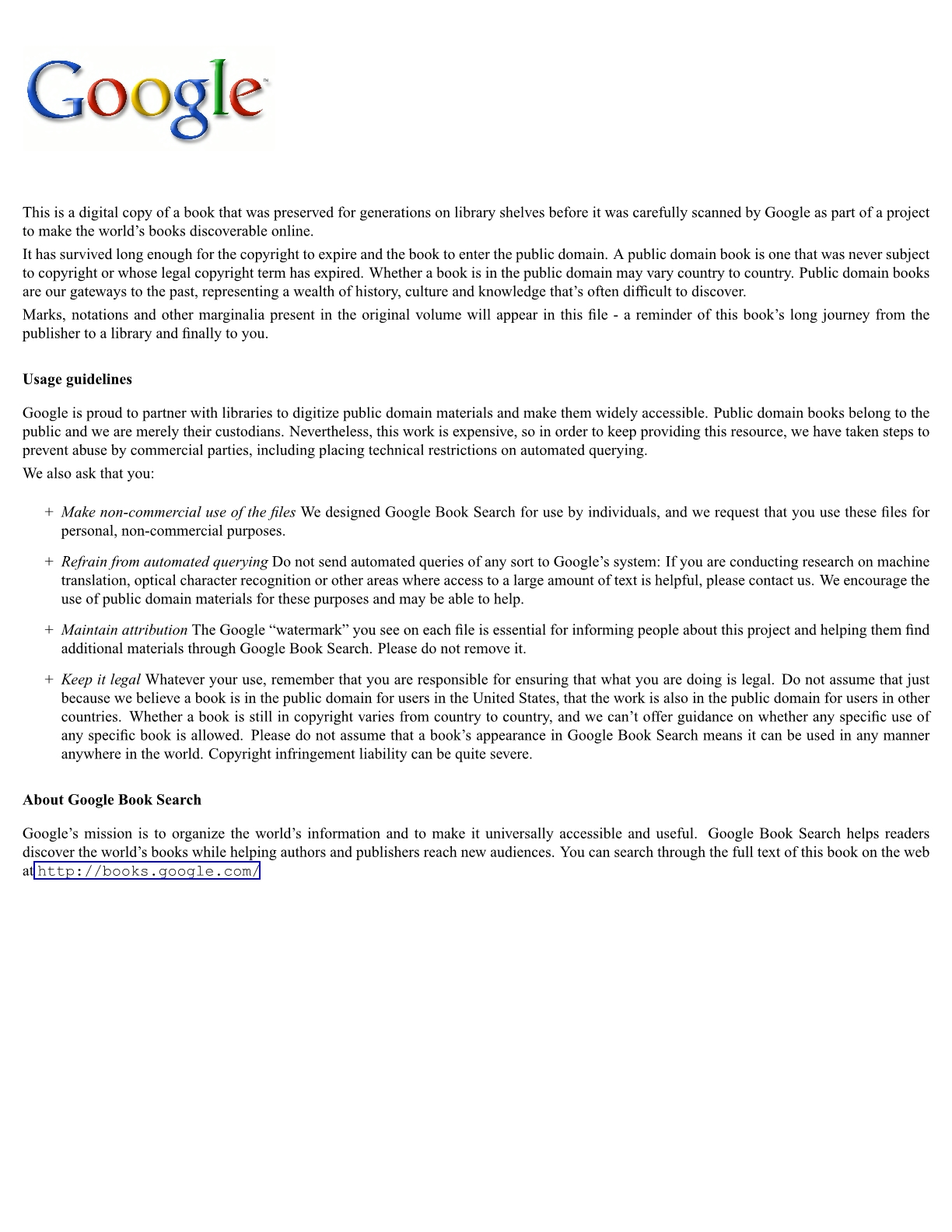 - Maintain attribution. The Google "watermark" you see on each file is essential for informing people about this project and helping them find additional materials through Google Book Search. Please do not remove it.