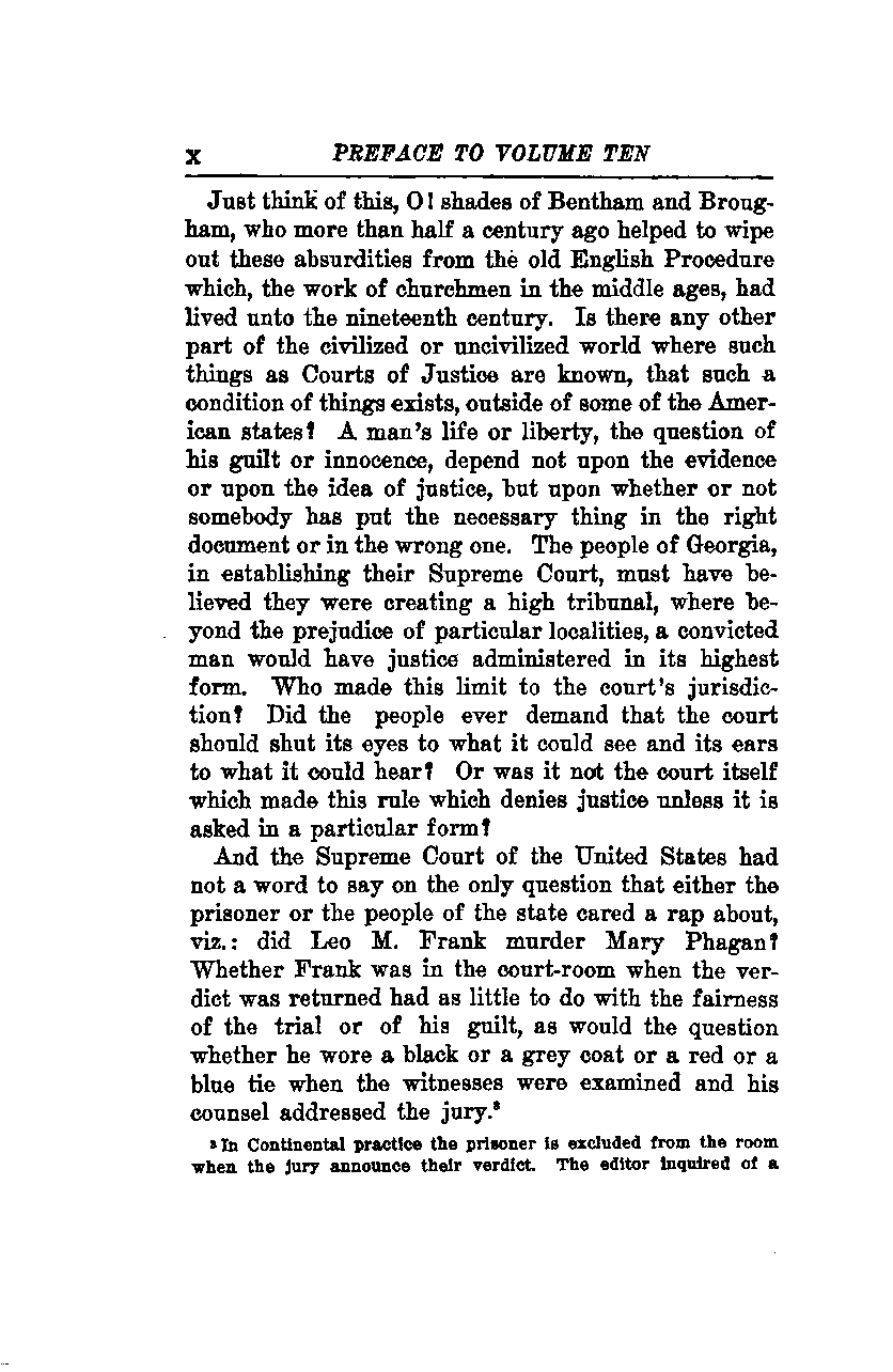 Just think of this, O! shades of Bentham and Brougham, who more than half a century ago helped to wipe out these absurdities from the old English Procedure. This procedure, the work of churchmen in the middle ages, had lived into the nineteenth century. Is there any other part of the civilized or uncivilized world where such things as Courts of Justice are known, that such a condition of things exists, outside of some of the American states? A man's life or liberty, the question of his guilt or innocence, depend not upon the evidence or upon the idea of justice, but upon whether or not somebody has put the necessary thing in the right document or in the wrong one. The people of Georgia, in establishing their Supreme Court, must have believed they were creating a high tribunal, where beyond the prejudice of particular localities, a convicted man would have justice administered in its highest form. Who made this limit to the court's jurisdiction? Did the people ever demand that the court should shut its eyes to what it could see and its ears to what it could hear? Or was it not the court itself which made this rule which denies justice unless it is asked in a particular form?