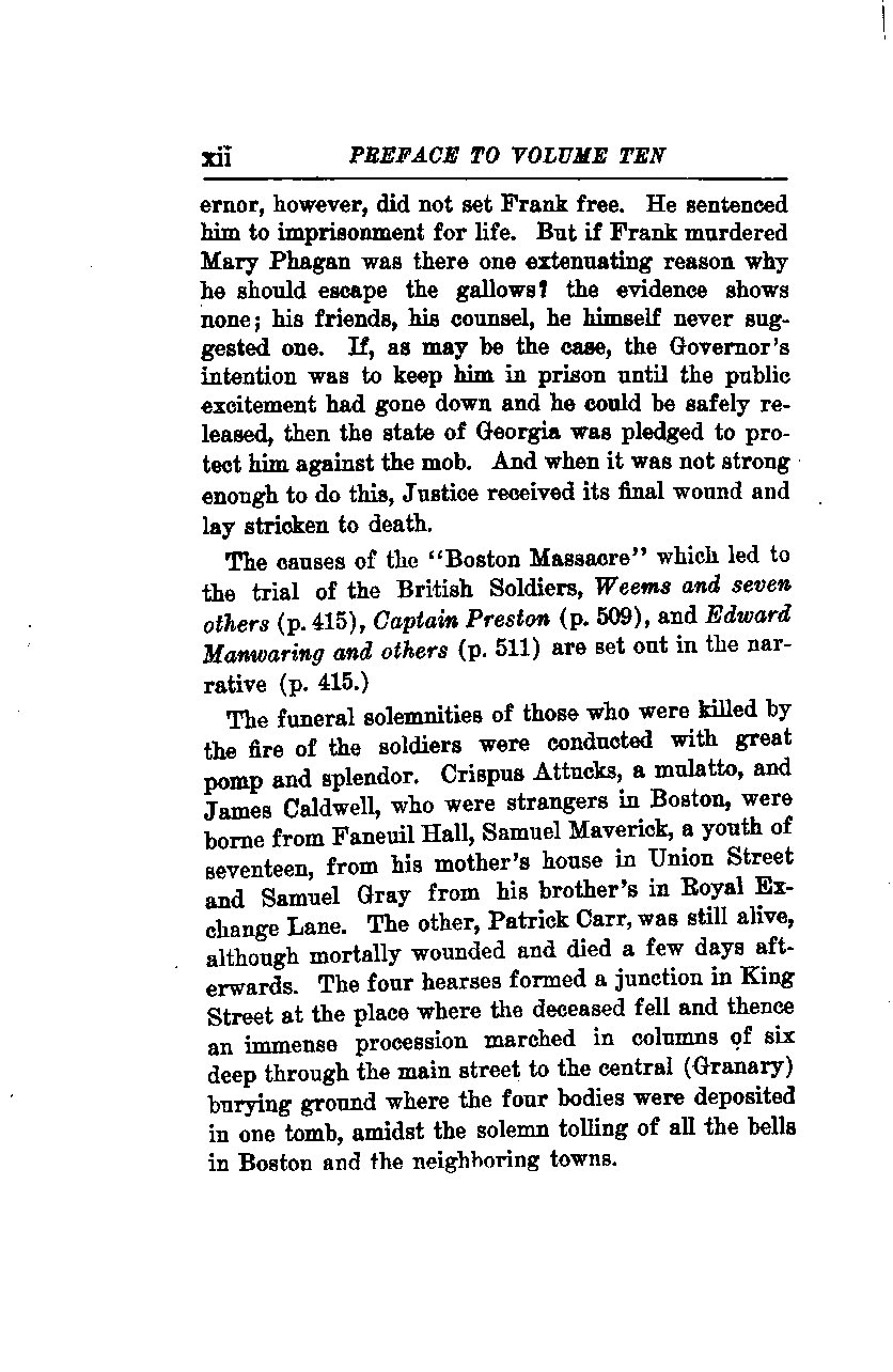 The causes of the "Boston Massacre," which led to the trial of the British Soldiers, Weems and seven others (p. 415), Captain Preston (p. 509), and Edward Manwaring and others (p. 511), are set out in the narrative (p. 415).