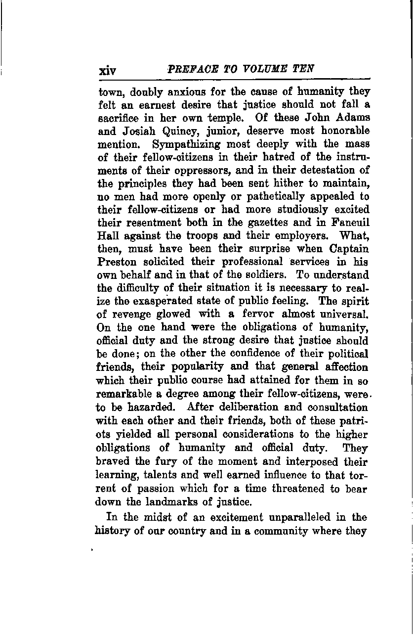 In the town, doubly anxious for the cause of humanity, the citizens felt an earnest desire that justice should not fall victim in her own temple. Among these, John Adams and Josiah Quincy, Jr., deserve the most honorable mention. They sympathized deeply with the masses of their fellow citizens in their hatred of the instruments of their oppressors and in their detestation of the principles these oppressors had been sent to maintain. No men had more openly or pathetically appealed to their fellow citizens or had more studiously excited their resentment, both in the gazettes and in Faneuil Hall, against the troops and their employers. What, then, must have been their surprise when Captain Preston solicited their professional services on his own behalf and that of the soldiers? To understand the difficulty of their situation, it is necessary to realize the exasperated state of public feeling. The spirit of revenge glowed with an almost universal fervor. On one hand were the obligations of humanity, official duty, and the strong desire that justice be done; on the other, the confidence of their political friends, their popularity, and the general affection which their public course had earned them in such a remarkable degree among their fellow citizens were at risk. After deliberation and consultation with each other and their friends, both of these patriots yielded all personal considerations to the higher obligations of humanity and official duty. They braved the fury of the moment and interposed their learning, talents, and well-earned influence against that torrent of passion which for a time threatened to sweep away the landmarks of justice.