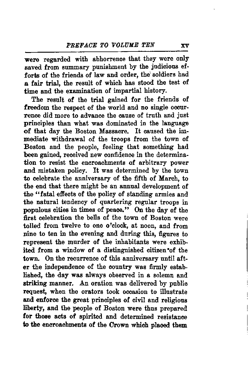 On the recurrence of this anniversary until after the independence of the country was firmly established, the day was always observed in a solemn and striking manner. An oration was delivered by public request, when the orators took occasion to illustrate and enforce the great principles of civil and religious liberty. The people of Boston were thus prepared for those acts of spirited and determined resistance to the encroachments of the Crown which placed them in the forefront of the struggle for independence.
