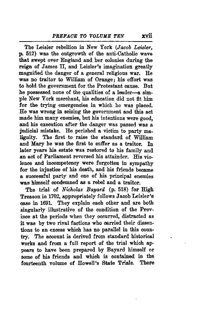 The trial of Nicholas Bayard (p. 518) for High Treason in 1702 appropriately follows Jacob Leisler’s case in 1691. They explain each other and are both singularly illustrative of the condition of the Province at the periods when they occurred, distracted as it was by two rival factions who carried their dissensions to an excess which has no parallel in this country. The account is derived from standard historical works and from a full report of the trial, which appears to have been prepared by Bayard himself or some of his friends and which is contained in the fourteenth volume of Howell’s State Trials.