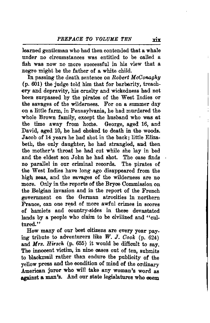 In sentencing Robert McConaghy to death (p. 601), the judge remarked that for barbarity, treachery, and depravity, McConaghy's cruelty and wickedness were unmatched by the pirates of the West Indies or the savages of the wilderness. On a summer day on a small farm in Pennsylvania, McConaghy murdered the entire Brown family, except for the husband who was away from home at the time. George, aged 16, and David, aged 10, were choked to death in the woods. Jacob, aged 14, was shot in the back; little Elizabeth, the only daughter, was strangled, and then the mother's throat was cut while she lay in bed. The eldest son, John, was also shot. This case finds no parallel in our criminal records. The pirates of the West Indies have long vanished from the high seas, and the savages of the wilderness are no more. Only in the reports of the Bryce Commission on the Belgian invasion and in the report of the French government on German atrocities in northern France can one read of more horrific crimes committed in scores of hamlets and countryside in these devastated lands by a people who claim to be civilized and "cultured."