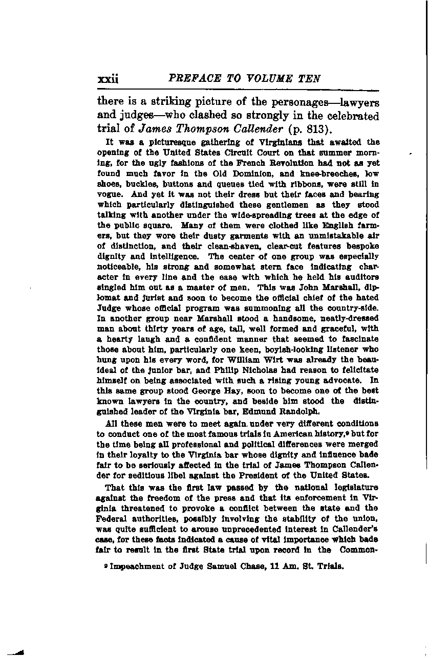 There is a striking picture of the personages—lawyers and judges—who clashed so strongly in the celebrated trial of James Thompson Callender (p. 813).