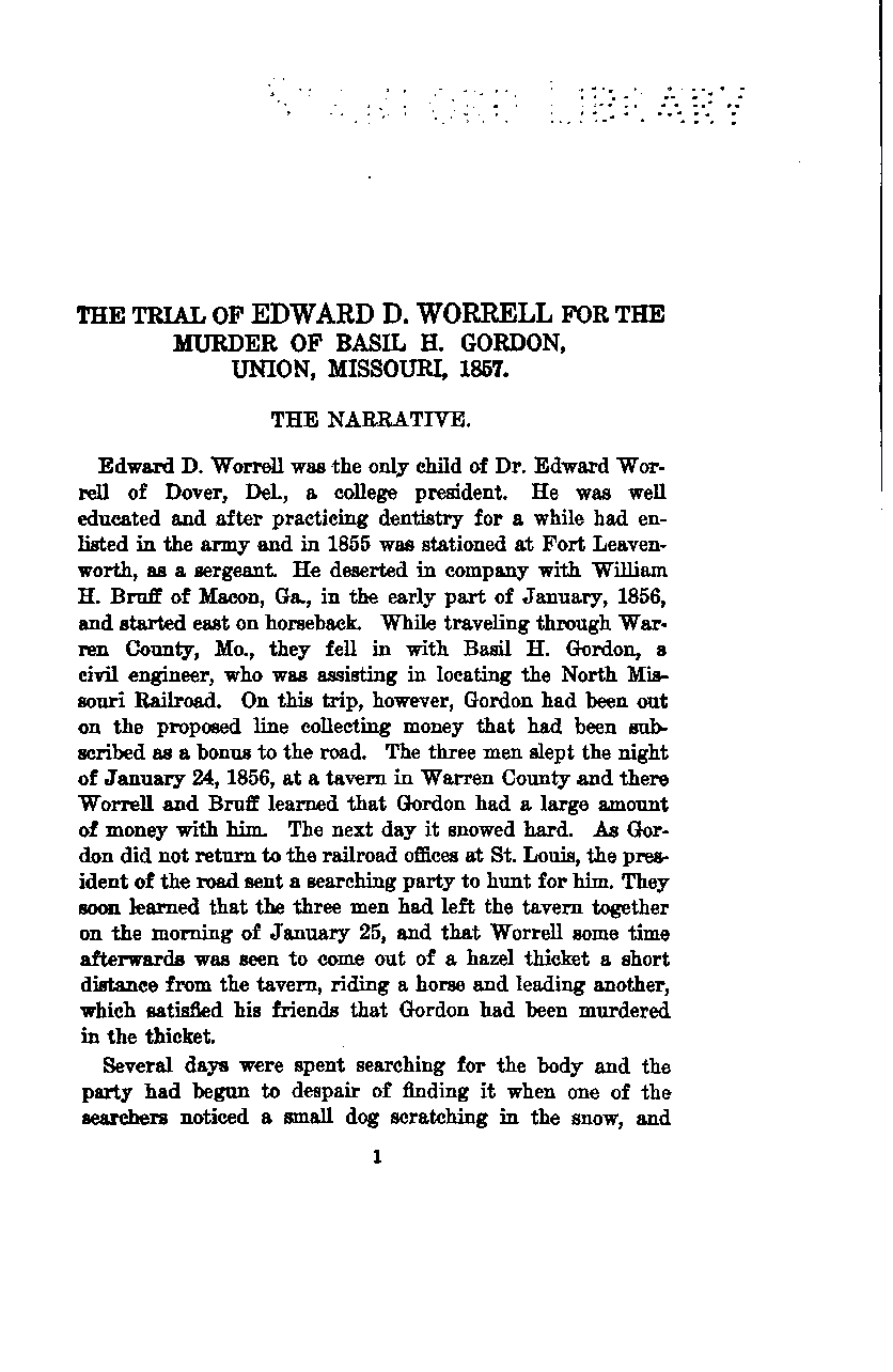 THE TRIAL OF EDWARD D. WORRELL FOR THE MURDER OF BASIL H. GORDON, UNION, MISSOURI, 1857