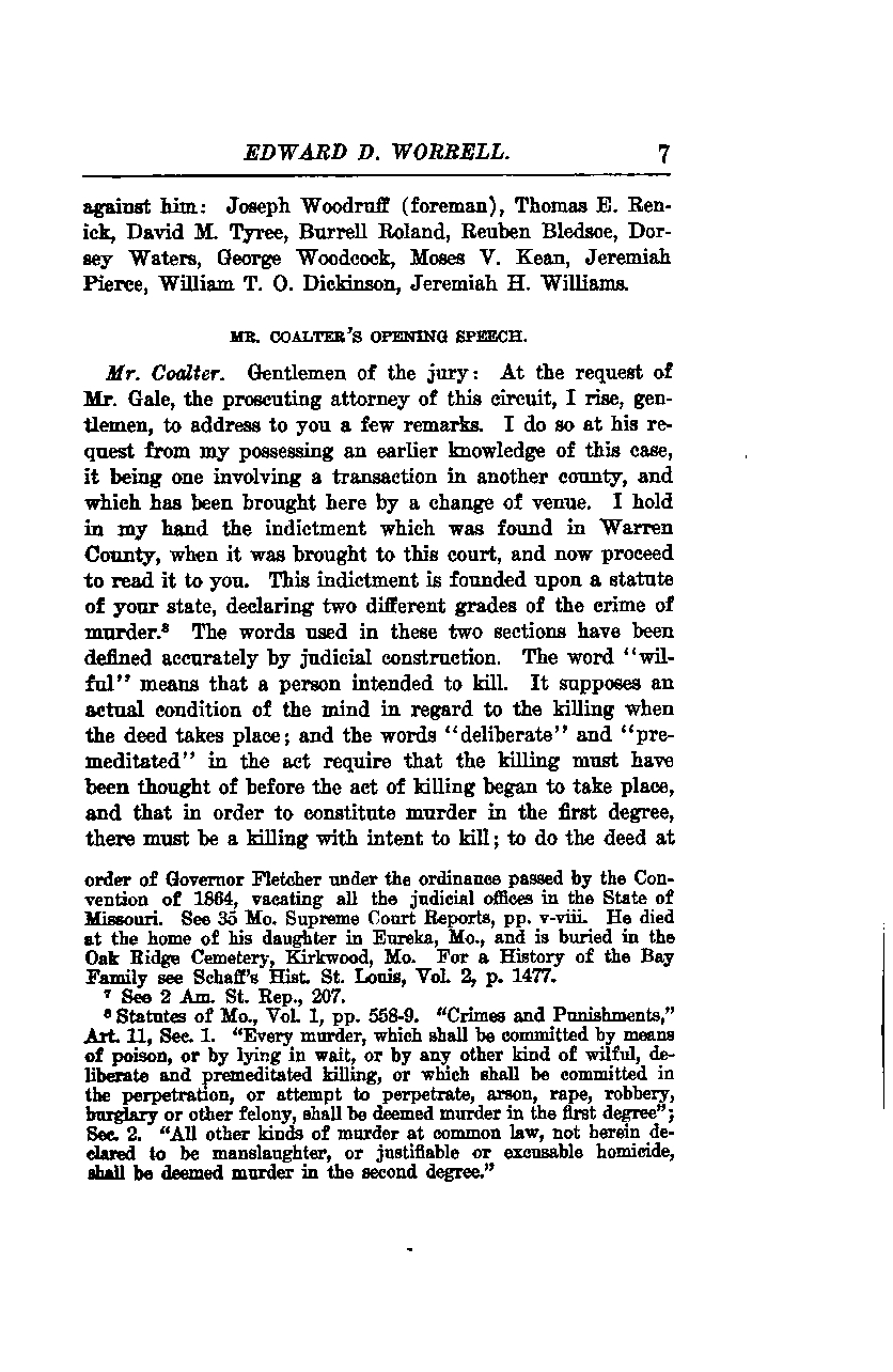 - Edward D. Worrell was removed from office by order of Governor Fletcher under the ordinances passed by the Convention of 1864, vacating all the judicial offices in the State of Missouri. See 35 Mo. Supreme Court Reports, pp. i. He died at the home of his daughter in Eureka, Mo., and is buried in the Oak Ridge Cemetery, Kirkwood, Mo. For a history of the Bay Family, see Schaff's Hist, St. Louis, Vol. 2, p. 1477.