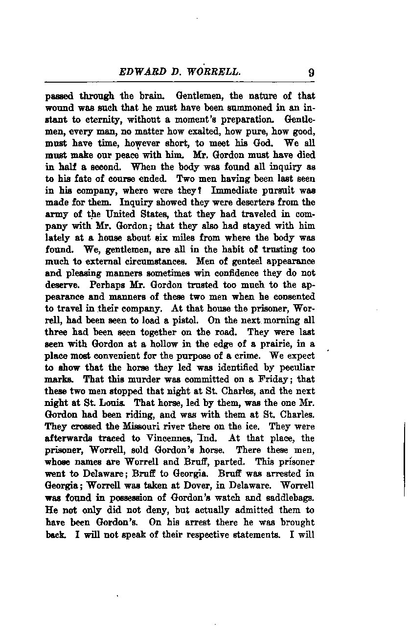 At that house, the prisoner, Worrell, had been seen to load a pistol. On the next morning, all three had been seen together on the road. They were last seen with Gordon at a hollow on the edge of a prairie, in a place most convenient for the purpose of a crime. We expect to show that the horse they led was identified by peculiar marks. This murder was committed on a Friday; these two men stopped that night at St. Charles, and the next night at St. Louis. The horse, led by them, was the one Mr. Gordon had been riding and was with them at St. Charles. They crossed the Missouri River there on the ice. They were afterwards traced to Vincennes, Indiana.