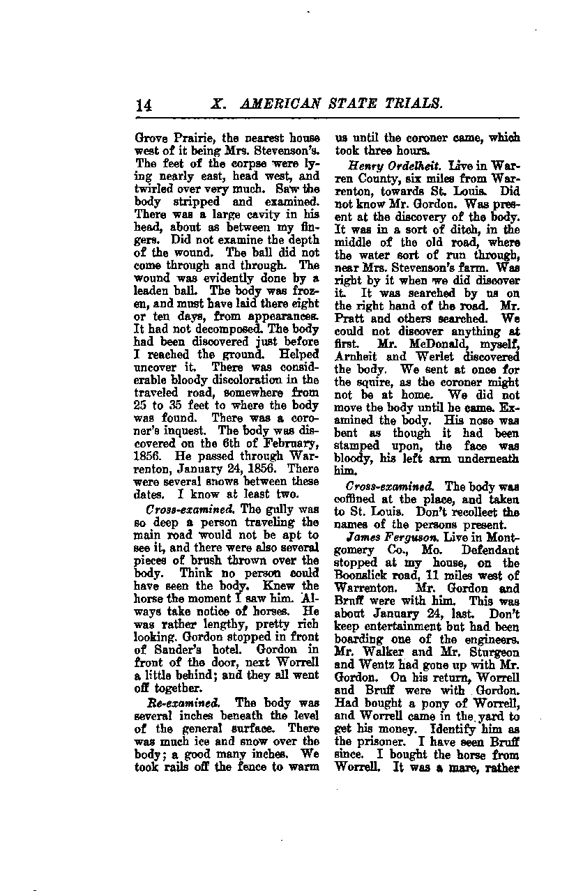 **Henry Ordetheit:** I live in Warren County, six miles from Warrenton, towards St. Louis. I did not know Mr. Gordon. I was present at the discovery of the body. It was in a sort of ditch, in the middle of the old road, where the water sort of ran through, near Mrs. Stevenson’s farm. I was right by it when we did discover it. It was searched by us on the right hand of the road. Mr. Pratt and others searched. We could not discover anything at first. Mr. McDonald, myself, Arnheit, and Werlet discovered the body. We sent at once for the squire, as the coroner might not be at home. We did not move the body until he came. I examined the body. His nose was bent as though it had been stamped upon, the face was bloody, his left arm underneath him.