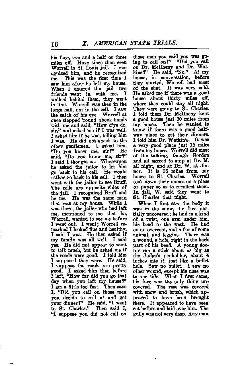 I saw Worrell's face, two and a half or three miles off. Since then, I have seen Worrell in St. Louis jail. I recognized him, and he recognized me. This was the first time I saw him after he left my house. When I entered the jail, two friends went in with me. I walked behind them; they went in first. Worrell was then in the large hall, not in the cell. I saw the catch of his eye. Worrell at once stepped around, shook hands with me, and said, "How d'ye do, sir," and asked me if I was well. I asked him if he was, telling him I was. He did not speak to the other gentlemen. I asked him, "Do you know me, sir?" He said, "Do you know me, sir?" I said I thought so. Whereupon he asked the jailor to let him go back to his cell. He would rather go back to his cell. I then went with the jailor to see Bruff. The cells are on opposite sides of the jail. I recognized Bruff, and he recognized me. He was the same man that was at my house. While I was there, the jailer, who had left me, mentioned to me that he, Worrell, wanted to see me before I went out. I went; Worrell remarked that I looked fine and healthy. I said I was. He then asked if my family was all well. I said yes. He did not appear to want to talk much, but he asked me if the roads were good. I told him I supposed they were. He said, "I suppose the roads are pretty good." I asked him then before I left, "How far did you go that day when you left my house?" I am a little too fast. Then says I, "Did you call on those men you decided to call at and get your dinner?" He said, "I went to St. Charles." Then said I, "I suppose you did not call on those men you said you were going to call on?" "Did you call on Dr. Mellheny and Dr. Watkins?" He said, "No." At my house, in conversation, before they started, Worrell had most of the chat. It was very cold. He asked me if there was a good house about thirty miles off, where they could stay all night. They were going to St. Charles. I told them Dr. Mellheny kept a good house just 30 miles from my house. Then he wanted to know if there was a good halfway place to get their dinners. I told him Dr. Watkins'. It was a very good place just 15 miles from my house. Worrell did most of the talking, though Gordon and all agreed to stop at Dr. M. all night, and at Dr. W. at dinner. It is 36 miles from my house to St. Charles. Worrell took down their names on a piece of paper so as to recollect them. In jail, W. said they went to St. Charles that night.