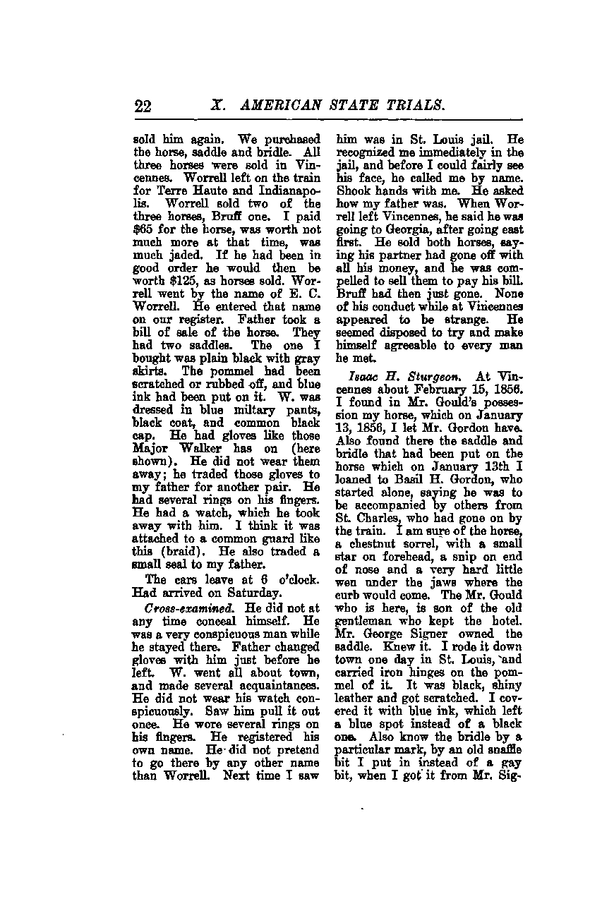 **Cross-examined:** He did not at any time conceal himself. He was a very conspicuous man while he stayed there. My father changed gloves with him just before he left. W. went all about town and made several acquaintances. He did not wear his watch conspicuously, though I saw him pull it out once. He wore several rings on his fingers and registered his own name. He did not pretend to go there by any other name than Worrell. The next time I saw him was in St. Louis jail. He recognized me immediately in the jail, and before I could fairly see his face, he called me by name and shook hands with me. He asked how my father was. When Worrell left Vincennes, he said he was going to Georgia after going east first. He sold both horses, saying his partner had gone off with all his money, and he was compelled to sell them to pay his bill. Bruff had then just gone. None of his conduct while at Vincennes appeared to be strange. He seemed disposed to try and make himself agreeable to every man he met.