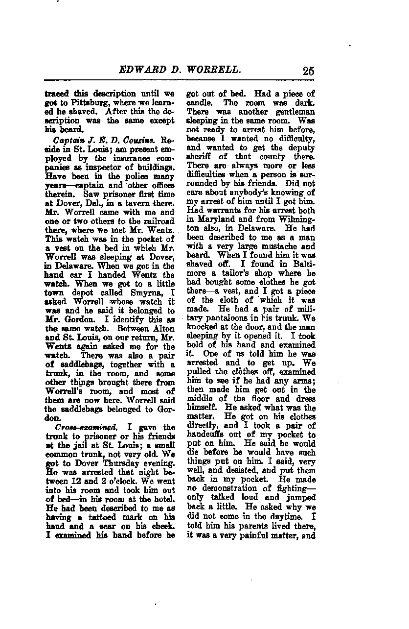 I gave the trunk to the prisoner or his friends at the jail in St. Louis; it was a small, common trunk, not very old. We got to Dover on Thursday evening. He was arrested that night between 12 and 2 o'clock. We went into his room and took him out of bed—in his room at the hotel. He had been described to me as having a tattooed mark on his hand and a scar on his cheek. I examined his hand before he got out of bed. He had a piece of sandal. The room was dark. There was another gentleman sleeping in the same room. I was not ready to arrest him before because I wanted no difficulty and wanted to get the deputy sheriff of that county there. There are always more or less difficulties when a person is surrounded by his friends. I did not care about anybody knowing of my arrest of him until I got him. I had warrants for his arrest both in Maryland and from Wilmington, Delaware. He had been described to me as a man with a very large mustache and beard. When I found him, it was shaved off. I found in Baltimore a tailor's shop where he had bought some clothes he got there—a vest, and I got a piece of the cloth of which it was made. He had a pair of military pantaloons in his trunk. We knocked at the door, and the man sleeping by it opened it. I took hold of his hand and examined it. One of us told him he was arrested and to get up. We pulled the clothes off, examined him to see if he had any arms; then made him get out in the middle of the floor and dress himself. He asked what was the matter. He got on his clothes directly, and I took a pair of handcuffs out of my pocket to put on him. He said he would die before he would have such things put on him. I said, "Very well," and desisted, and put them back in my pocket. He made no demonstration of fighting—only talked loud and jumped back a little. He asked why we did not come in the daytime. I told him his parents lived there, it was a very painful matter, and...