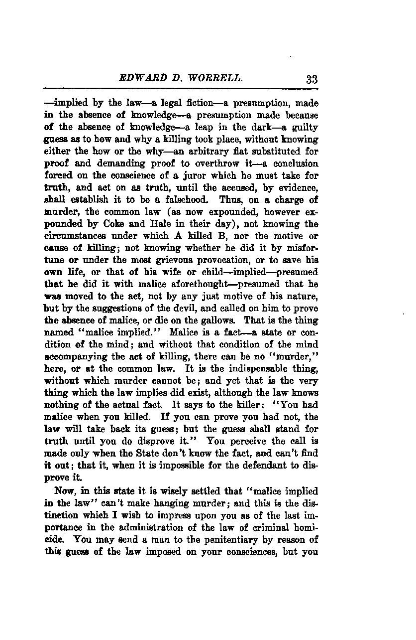 Now, in this state, it is wisely settled that "malice implied in the law" can't make hanging murder; and this is the distinction which I wish to impress upon you as of the last importance in the administration of the law of criminal homicide. You may send a man to the penitentiary by reason of this guess of the law imposed on your consciences, but you cannot send him to the gallows based on this presumption alone.