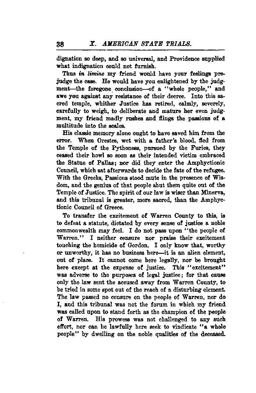 His classic memory alone ought to have saved him from the error. When Orestes, wet with a father's blood, fled from the Temple of the Pythoness, pursued by the Furies, they ceased their howl as soon as their intended victim embraced the Statue of Pallas; nor did they enter the Amphictyonic Council, which sat afterwards to decide the fate of the refugee. With the Greeks, Passions stood mute in the presence of Wisdom, and the genius of that people shut them quite out of the Temple of Justice. The spirit of our law is wiser than Minerva, and this tribunal is greater, more sacred, than the Amphictyonic Council of Greece.