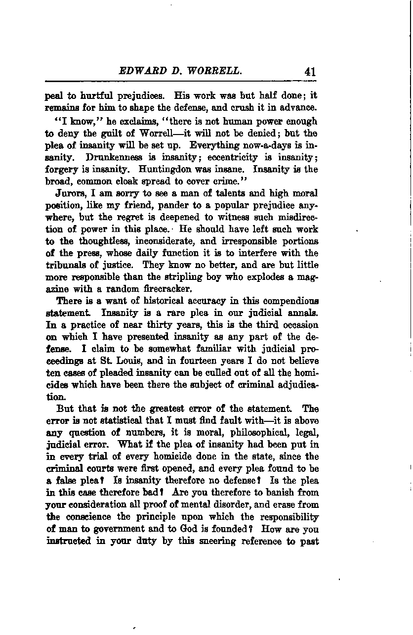 "I know," he exclaims, "there is not human power enough to deny the guilt of Worrell—it will not be denied; but the plea of insanity will be set up. Everything nowadays is insanity. Drunkenness is insanity; eccentricity is insanity; forgery is insanity. Huntingdon was insane. Insanity is the broad, common cloak spread to cover crime."