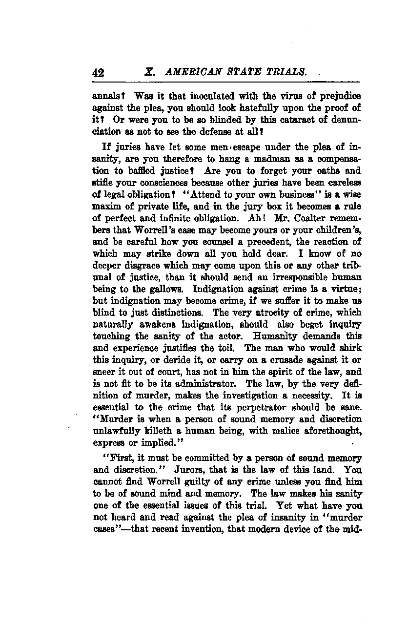 If juries have let some men escape under the plea of insanity, are you therefore to hang a madman as compensation to baffled justice? Are you to forget your oaths and stifle your consciences because other juries have been careless of legal obligation? "Attend to your own business" is a wise maxim of private life, and in the jury box it becomes a rule of perfect and infinite obligation. Ah! Mr. Coalter remembers that Worrell's case may become yours or your children's, and be careful how you counsel a precedent, the reaction of which may strike down all you hold dear. I know of no deeper disgrace which may come upon this or any other tribunal of justice than that it should send an irresponsible human being to the gallows. Indignation against crime is a virtue; but indignation may become a crime if we suffer it to make us blind to just distinctions. The very atrocity of crime, which naturally awakens indignation, should also beget inquiry touching the sanity of the actor. Humanity demands this, and experience justifies the toil. The man who would shirk this inquiry, or deride it, or carry on a crusade against it, or sneer it out of court, has not in him the spirit of the law and is not fit to be its administrator. The law, by the very definition of murder, makes the investigation a necessity. It is essential to the crime that its perpetrator should be sane. "Murder is when a person of sound memory and discretion unlawfully killeth a human being, with malice aforethought, express or implied."