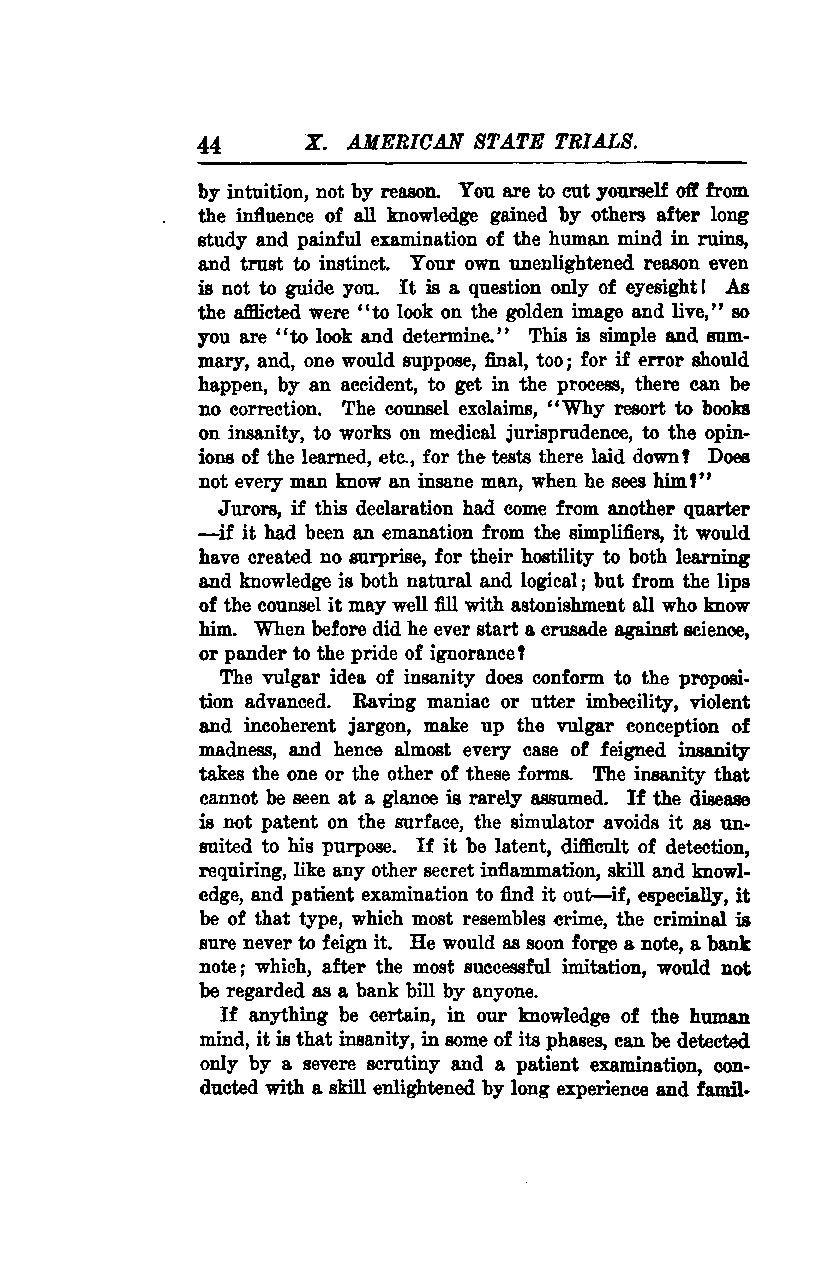 You are to judge by intuition, not by reason. You are to cut yourself off from the influence of all knowledge gained by others after long study and painful examination of the human mind in ruins, and trust to instinct. Your own unenlightened reason is not even to guide you. It is a question only of eyesight! As the afflicted were "to look on the golden image and live," so you are "to look and determine." This is simple and summary, and, one would suppose, final, too; for if error should happen, by an accident, to get into the process, there can be no correction. The counsel exclaims, "Why resort to books on insanity, to works on medical jurisprudence, to the opinions of the learned, etc., for the tests there laid down? Does not every man know an insane man when he sees him!"