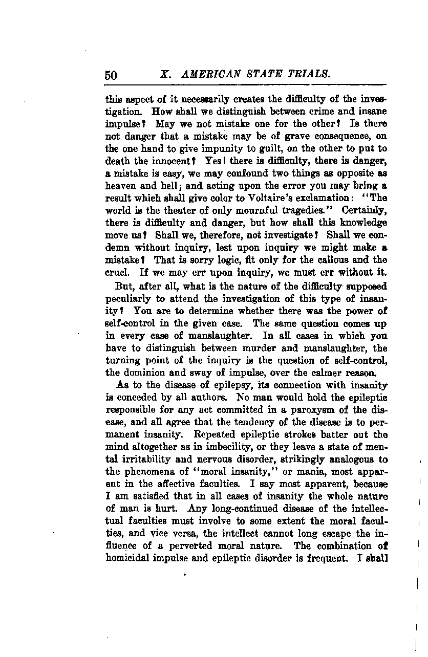 As to the disease of epilepsy, its connection with insanity is conceded by all authors. No man would hold the epileptic responsible for any act committed in a paroxysm of the disease, and all agree that the tendency of the disease is to permanent insanity. Repeated epileptic strokes batter out the mind altogether, as in imbecility, or they leave a state of mental irritability and nervous disorder, strikingly analogous to the phenomena of "moral insanity," or mania, most apparent in the affective faculties. I say most apparent, because I am satisfied that in all cases of insanity the whole nature of man is hurt. Any long-continued disease of the intellectual faculties must involve to some extent the moral faculties, and vice versa; the intellect cannot long escape the influence of a perverted moral nature. The combination of homicidal impulse and epileptic disorder is frequent. I shall...