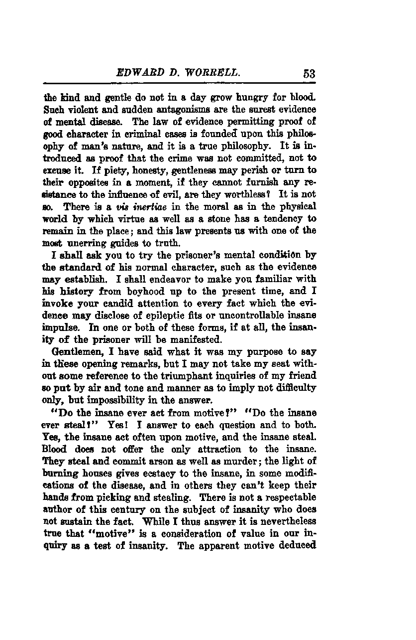 "Do the insane ever act from motive?" "Do the insane ever steal?" Yes! I answer to each question and to both. Yes, the insane act often upon motive, and the insane steal. Blood does not offer the only attraction to the insane. They steal and commit arson as well as murder; the light of burning houses gives ecstasy to the insane, in some modifications of the disease, and in others they can't keep their hands from picking and stealing. There is not a respectable author of this century on the subject of insanity who does not sustain the fact. While I thus answer, it is nevertheless true that "motive" is a consideration of value in our inquiry as a test of insanity. The apparent motive deduced