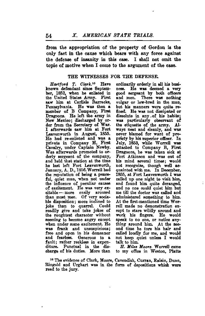 **Hartford T. Clark:** I have known the defendant since September 1852, when he enlisted in the United States Army. I first saw him at Carlisle Barracks, Pennsylvania. He was then a member of B Company, First Dragoons. He left the army in New Mexico, discharged by order from the Secretary of War. I afterwards saw him at Fort Leavenworth in August 1855. He had re-enlisted and was a private in Company H, First Cavalry, under Captain Newby. He was later promoted to orderly sergeant of the company and held that position when he last left Fort Leavenworth in January 1856. Worrell had the reputation of being a peaceful, quiet man when not under the influence of peculiar causes of excitement. He was very excitable—more easily aroused than most men. He had a very sociable disposition; more inclined to joke than to quarrel. He could readily give and take jokes of the roughest character without seeming to become angry, except when under some excitement. He was frank and unsuspicious; free and open in his demeanor and fearless. He was generous to a fault; rather reckless in expenditure. He was punctual in the discharge of his duties and more than ordinarily orderly in all his business. He was deemed a very good sergeant by both officers and men. There was nothing vulgar or low-bred in the man, but his manners were quite refined. He was not dissipated or dissolute in any of his habits; he was particularly observant of the etiquette of the army. He was always neat and cleanly and was never blamed for want of propriety by his superior officer.