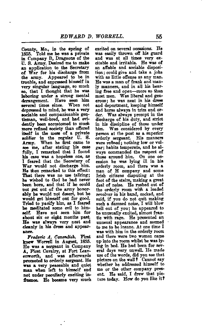 I first met Edward D. Worrell in Boone County, Missouri, in the spring of 1855. He told me he was a private in Company B, Dragoons of the U.S. Army. He desired me to make an application to the Secretary of War for his discharge from the army. He appeared to be in trouble and expressed himself in very singular language, so much so that I thought he was laboring under strong mental derangement. I have seen him several times since. When not depressed in mind, he was a very sociable and companionable gentleman, well-bred, and had evidently been accustomed to much more refined society than offered itself in the mess of a private soldier in the regular U.S. Army.