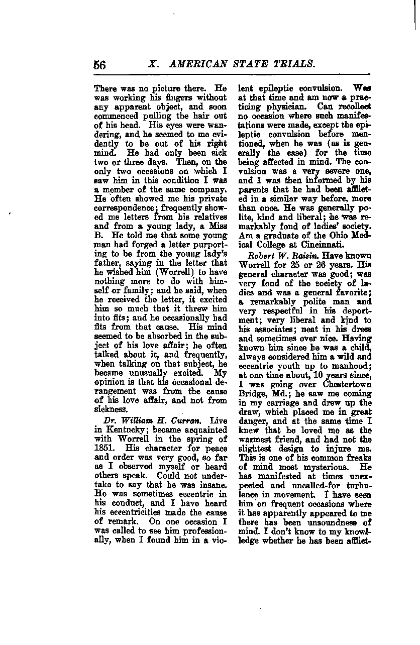 Dr. William H. Curran lives in Kentucky; I became acquainted with Worrell in the spring of 1851. His character for peace and order was very good, so far as I observed myself or heard others speak. I could not undertake to say that he was insane. He was sometimes eccentric in his conduct, and I have heard his eccentricities made the cause of remark. On one occasion, I was called to see him professionally, when I found him in a violent epileptic convulsion. I was at that time and am now a practicing physician. I can recollect no occasion where such manifestations were made, except the epileptic convulsion before mentioned, when he was (as is generally the case) for the time being affected in mind. The convulsion was a very severe one, and I was then informed by his parents that he had been afflicted in a similar way before, more than once. He was generally polite, kind, and liberal; he was remarkably fond of ladies' society. I am a graduate of the Ohio Medical College at Cincinnati.