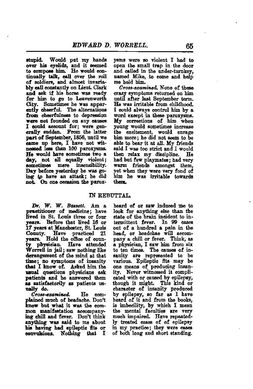 I am a practitioner of medicine; have lived in St. Louis three or four years. Before that, I lived 16 or 17 years at Manchester, St. Louis County. I have practiced for 21 years. I hold the office of county physician. I have attended Worrell in jail; I saw nothing like derangement of the mind at that time, no symptoms of insanity that I know of. I asked him the usual questions physicians ask patients, and he answered them as satisfactorily as patients usually do. He complained much of headache. I don't know but what it was the common manifestation accompanying chill and fever. I don't think anything was said to me about his having had convulsions. Nothing I heard of or saw induced me to look for anything else than the state of the brain incident to intermittent fever. In 99 cases out of a hundred, a pain in the head, or headache, will accompany a chill or fever. I think, as a physician, I saw him from six to ten times. The causes of insanity are represented to be various. Epileptic fits may be one means of producing insanity. I have never witnessed it complicated with or caused by epilepsy, though it might. This kind or character of insanity produced by epilepsy, so far as I have seen it and from the books, is imbecility, by which I mean the mental faculties are very much impaired. I have repeatedly treated cases of epilepsy in my practice; they were cases of both long and short standing.