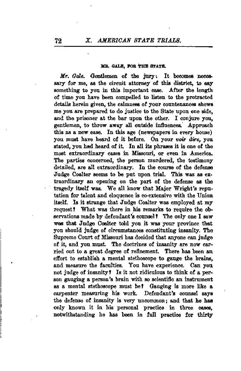 Mr. Gale: Gentlemen of the jury, it becomes necessary for me, as the circuit attorney of this district, to address you in this important case. After the length of time you have been compelled to listen to the protracted details presented here, the calmness of your countenances shows me that you are prepared to do justice to the State on one side, and to the prisoner at the bar on the other. I implore you, gentlemen, to set aside all external influences and approach this as a new case. In this age, with newspapers in every home, you must have heard of it before. During your voir dire, you stated that you had heard of it. In all its aspects, it is one of the most extraordinary cases in Missouri, or even in America. The parties involved, the person murdered, and the testimony detailed are all extraordinary.