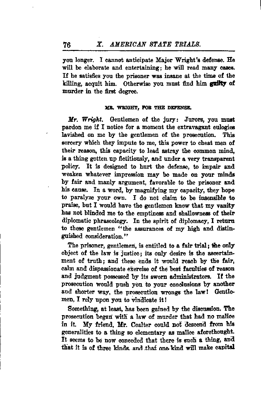 Mr. Wright: Gentlemen of the jury, you must pardon me if I notice for a moment the extravagant eulogies lavished on me by the gentlemen of the prosecution. This sorcery which they impute to me, this power to cheat men of their reason, this capacity to lead astray the common mind, is a thing gotten up fictitiously, and under a very transparent policy. It is designed to hurt the defense, to impair and weaken whatever impression may be made on your minds by fair and manly argument, favorable to the prisoner and his cause. In a word, by magnifying my capacity, they hope to paralyze your own. I do not claim to be insensible to praise, but I would have the gentlemen know that my vanity has not blinded me to the emptiness and shallowness of their diplomatic phraseology. In the spirit of diplomacy, I return to these gentlemen "the assurances of my high and distinguished consideration."