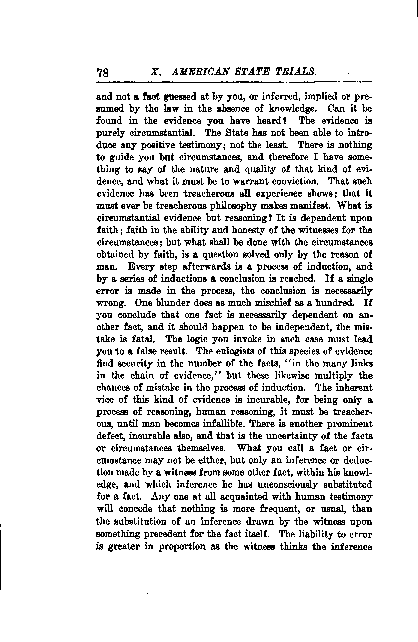The eulogists of this species of evidence find security in the number of the facts, "in the many links in the chain of evidence," but these likewise multiply the chances of mistake in the process of induction. The inherent vice of this kind of evidence is incurable, for being only a process of reasoning, human reasoning, it must be treacherous until man becomes infallible. There is another prominent defect, incurable also, and that is the uncertainty of the facts or circumstances themselves. What you call a fact or circumstance may not be either, but only an inference or deduction made by a witness from some other fact within his knowledge, and which inference he has unconsciously substituted for a fact.