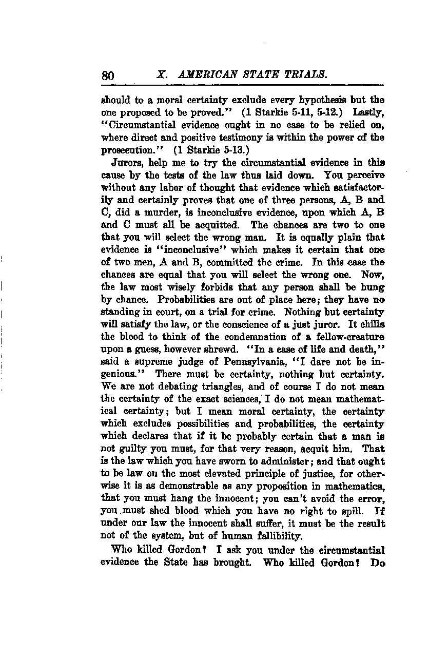 Jurors, help me to try the circumstantial evidence in this case by the tests of the law thus laid down. You perceive without any labor of thought that evidence which satisfactorily and certainly proves that one of three persons, A, B, and C, did a murder, is inconclusive evidence, upon which A, B, and C must all be acquitted. The chances are two to one that you will select the wrong man. It is equally plain that evidence is "inconclusive" which makes it certain that one of two men, A and B, committed the crime. In this case, the chances are equal that you will select the wrong one. Now, the law most wisely forbids that any person shall be hung by chance. Probabilities are out of place here; they have no standing in court, on a trial for crime. Nothing but certainty will satisfy the law, or the conscience of a just juror. It chills the blood to think of the condemnation of a fellow-creature upon a guess, however shrewd. "In a case of life and death," said a supreme judge of Pennsylvania, "I dare not be ingenious." There must be certainty, nothing but certainty. We are not debating triangles, and of course I do not mean the certainty of the exact sciences, I do not mean mathematical certainty; but I mean moral certainty, the certainty which excludes possibilities and probabilities, the certainty which declares that if it be probably certain that a man is not guilty you must, for that very reason, acquit him. That is the law which you have sworn to administer; and that ought to be law on the most elevated principle of justice, for otherwise it is as demonstrable as any proposition in mathematics, that you must hang the innocent; you can't avoid the error, you must shed blood which you have no right to spill. If under our law the innocent shall suffer, it must be the result, not of the system, but of human fallibility.