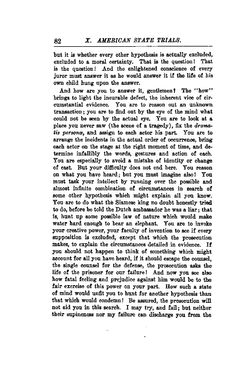 You are to do what the Siamese king no doubt honestly tried to do before he told the Dutch ambassador he was a liar; that is, search for some possible law of nature that would make water hard enough to bear an elephant. You are to invoke your creative power, your faculty of invention, to see if every supposition is excluded except that which the prosecution makes to explain the circumstances detailed in evidence. If you should fail to think of something that might account for all you have heard, if it should escape the counsel, the single counsel for the defense, the prosecution demands the life of the prisoner for your failure! And now you see also how fatal feeling and prejudice against him would be to the fair exercise of this power on your part. How such a state of mind would unfit you to search for another hypothesis than the one that would condemn! Be assured, the prosecution will not aid you in this search. I may try, and fail; but neither their inaction nor my failure can discharge you from the responsibility.