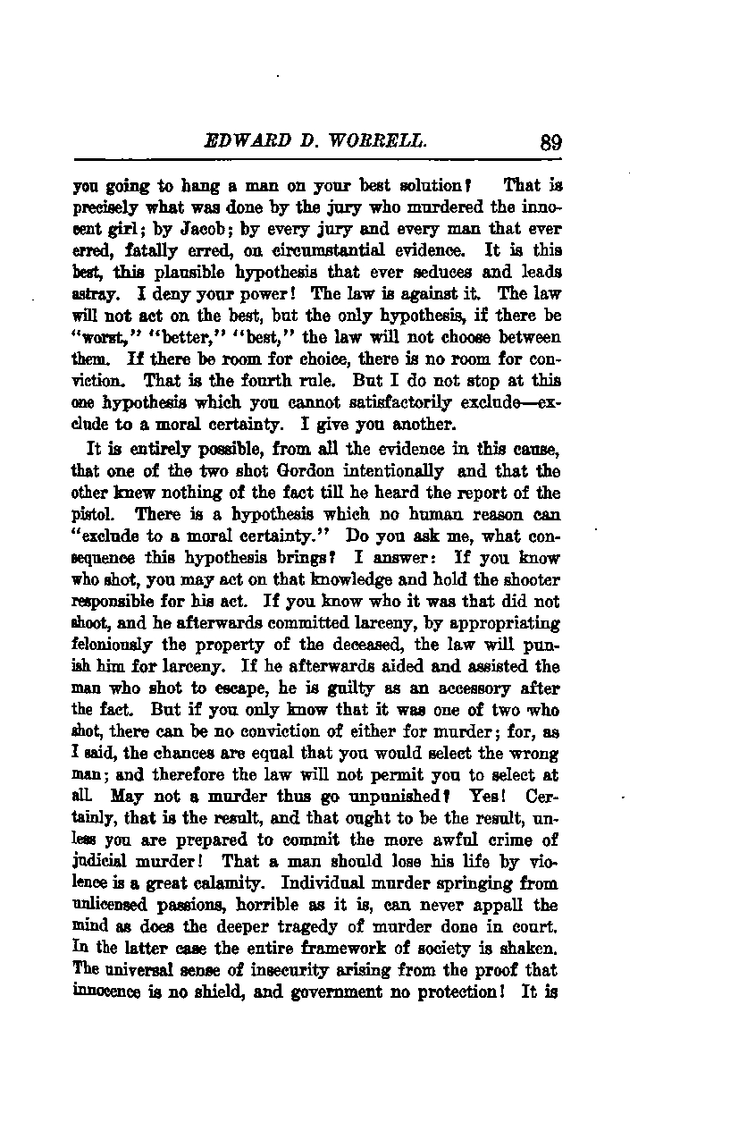 Are you going to hang a man based on your best solution? That is precisely what was done by the jury who murdered the innocent girl; by Jacob; by every jury and every man that ever erred, fatally erred, on circumstantial evidence. It is this best, this plausible hypothesis that ever seduces and leads astray. I deny your power! The law is against it. The law will not act on the best, but the only hypothesis, if there be a "worst," "better," or "best," the law will not choose between them. If there is room for choice, there is no room for conviction. That is the fourth rule. But I do not stop at this one hypothesis which you cannot satisfactorily exclude—exclude to a moral certainty. I give you another.