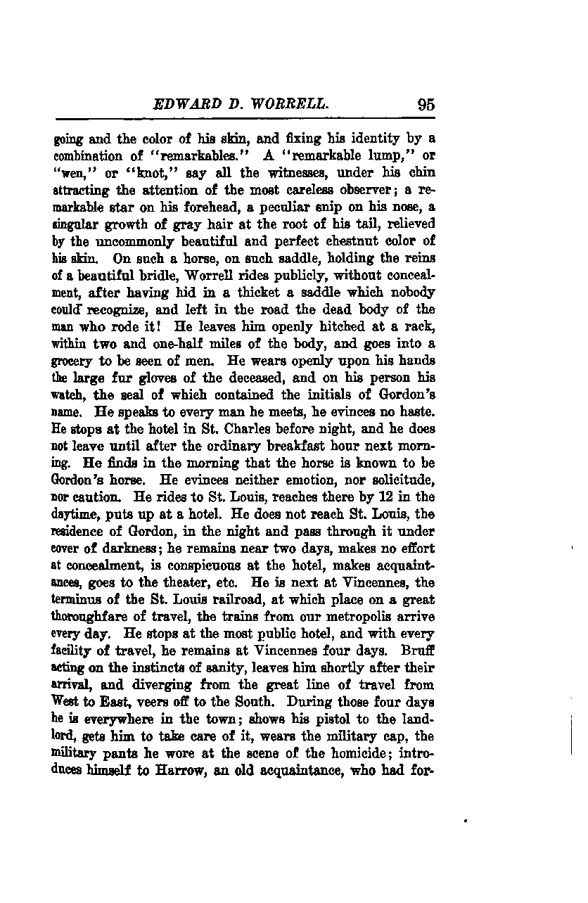 Worrell wore the large fur gloves of the deceased openly on his hands and carried the man's watch, the seal of which bore the initials of Gordon's name. He spoke to every man he met, showing no signs of haste. Before nightfall, he stopped at a hotel in St. Charles and did not leave until after the usual breakfast hour the next morning. Upon discovering that the horse was known to be Gordon's, he displayed neither emotion, solicitude, nor caution.