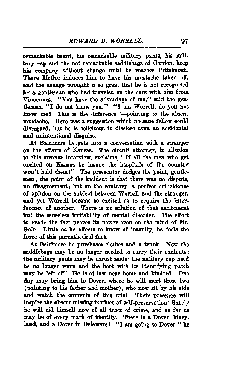 Edward D. Worrell, with his remarkable beard, his remarkable military pants, his military cap, and the not-so-remarkable saddlebags of Gordon, keeps his company without change until he reaches Pittsburgh. There, McGee induces him to have his mustache taken off, and the change wrought is so great that he is not recognized by a gentleman who had traveled on the cars with him from Vincennes. "You have the advantage of me," said the gentleman, "I do not know you." "I am Worrell, do you not know me? This is the difference"—pointing to the absent mustache. Here was a suggestion which no sane fellow could disregard, but he is solicitous to disclose even an accidental and unintentional disguise.