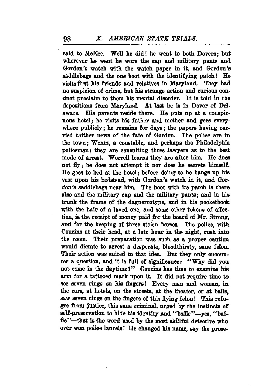 Late at night, the police, led by Couzins, rushed into the room. Their preparation was such as proper caution would dictate to arrest a desperate, bloodthirsty, sane felon. Their actions were suited to that idea, but they only encountered a question, full of significance: "Why did you not come in the daytime?" Couzins had time to examine his arm for a tattooed mark. It did not require time to see the seven rings on his fingers! Every man and woman, in the cars, at hotels, on the streets, at the theater, or at balls, saw seven rings on the fingers of this fleeing felon! This refugee from justice, this sane criminal, urged by the instincts of self-preservation to hide his identity and "baffle"—yes, "baffle"—that is the word used by the most skillful detective who ever won police laurels! He changed his name, say the prosecutors.