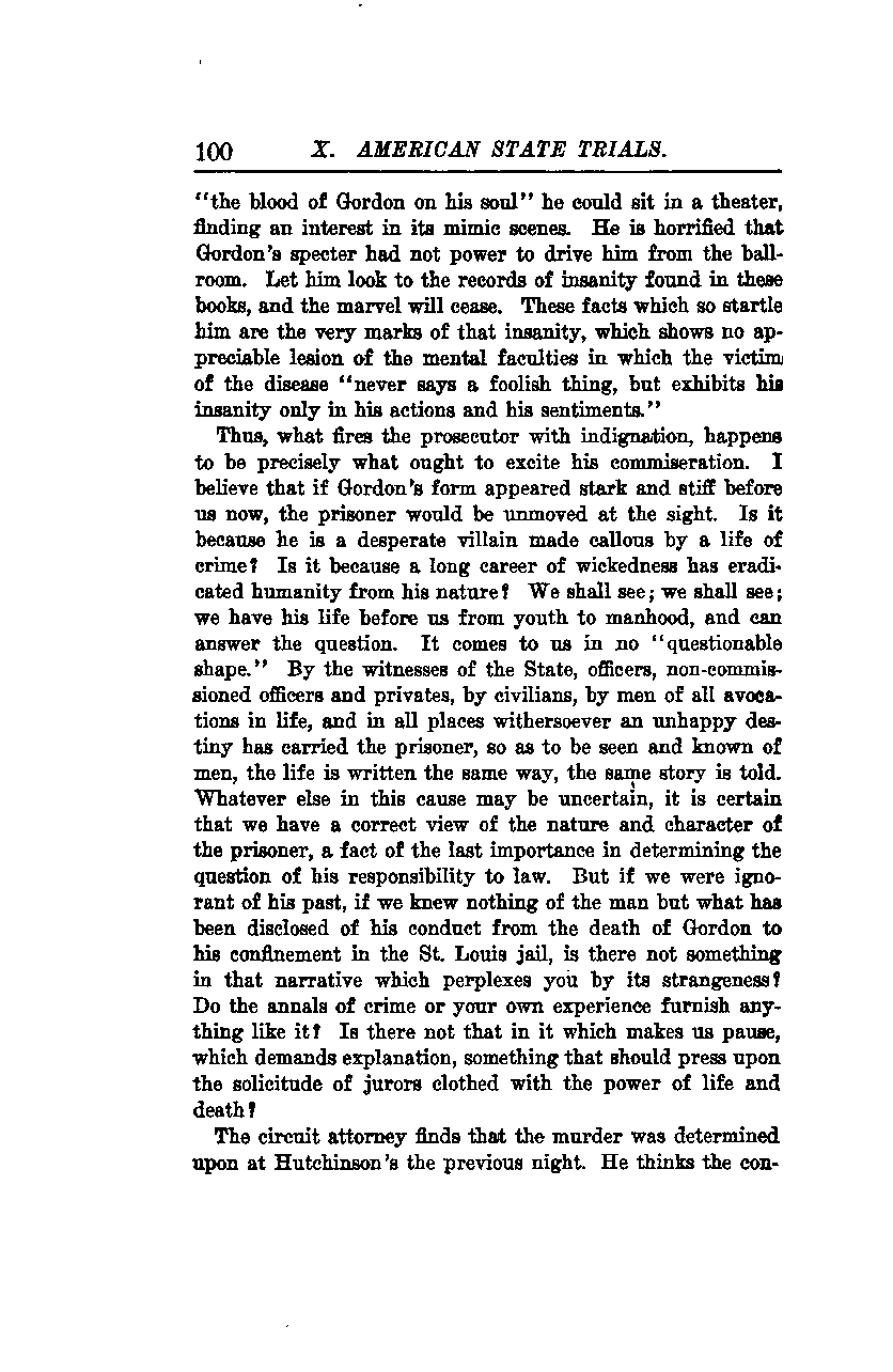 "The blood of Gordon on his soul," he could sit in a theater, finding an interest in its mimetic scenes. He is horrified that Gordon's specter had not the power to drive him from the ballroom. Let him look to the records of insanity found in these books, and the marvel will cease. These facts, which so startle him, are the very marks of that insanity which shows no appreciable lesion of the mental faculties, in which the victim of the disease "never says a foolish thing, but exhibits his insanity only in his actions and his sentiments."