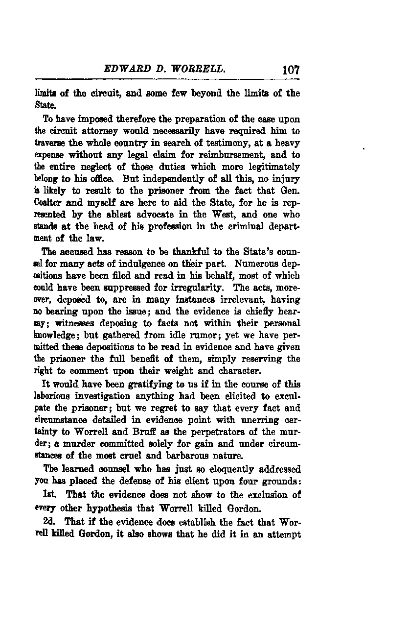 The limits of the circuit, and some few beyond the limits of the state, have been considered in this case. To have imposed the preparation of the case upon the circuit attorney would necessarily have required him to traverse the whole country in search of testimony, at a heavy expense without any legal claim for reimbursement, and to the entire neglect of those duties which more legitimately belong to his office. But independently of all this, no injury is likely to result to the prisoner from the fact that General Coalter and myself are here to aid the state, for he is represented by the ablest advocate in the West, and one who stands at the head of his profession in the criminal department of the law.