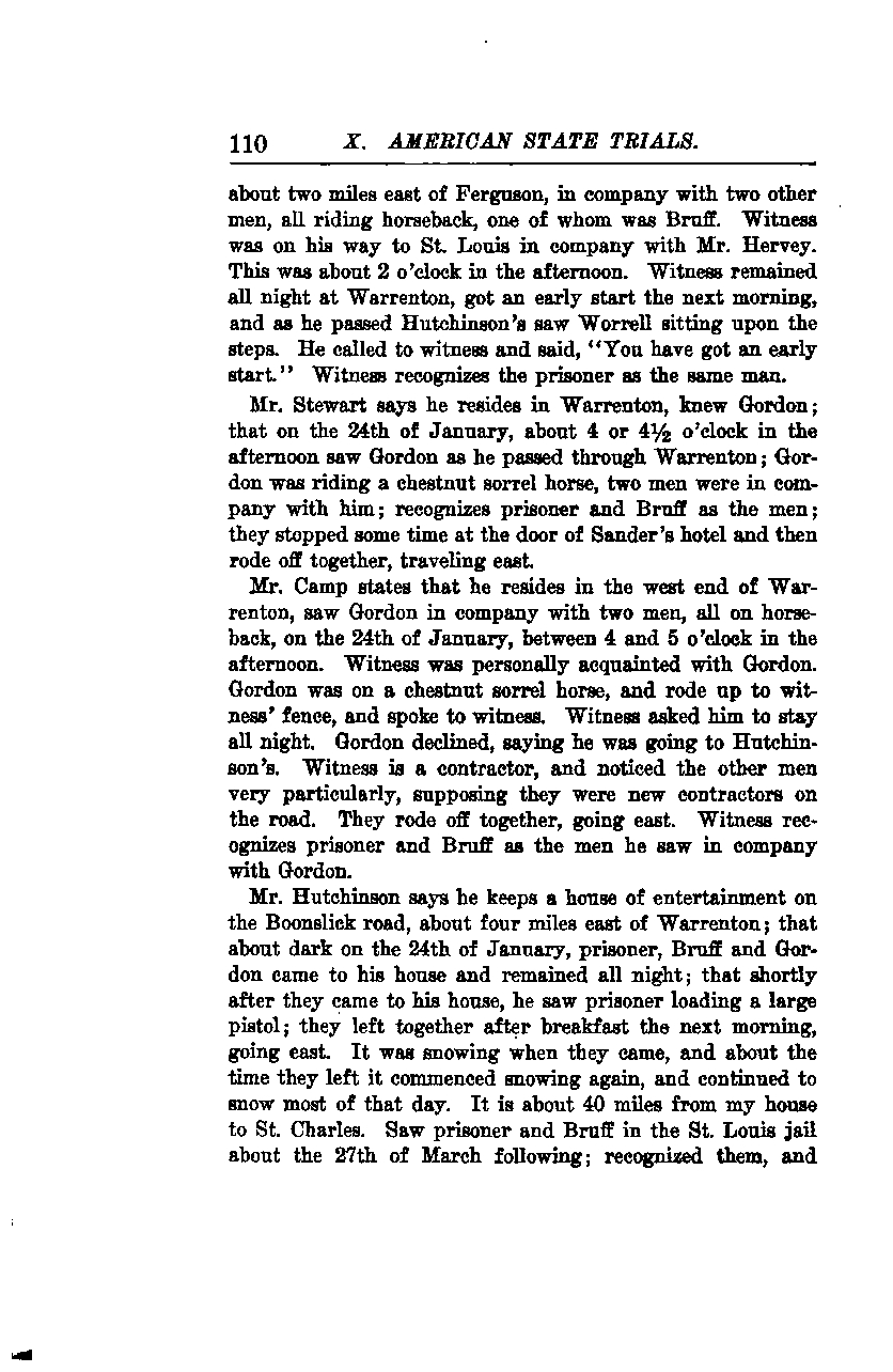 Mr. Hutchinson, who keeps a house of entertainment on the Boonslick road about four miles east of Warrenton, stated that around dark on the 24th of January, the prisoner, Bruff, and Gordon came to his house and remained overnight. Shortly after they arrived, Mr. Hutchinson saw the prisoner loading a large pistol. They left together after breakfast the next morning, heading east. It was snowing when they arrived, and about the time they left, it started snowing again, continuing most of that day. It is about 40 miles from Mr. Hutchinson's house to St. Charles. He saw the prisoner and Bruff in the St. Louis jail around the 27th of March following and recognized them.