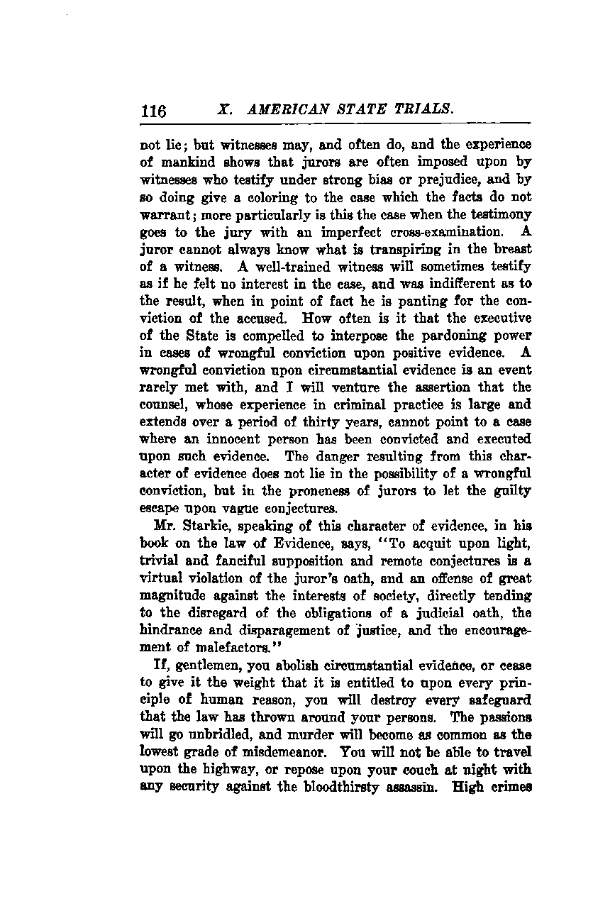 If, gentlemen, you abolish circumstantial evidence, or cease to give it the weight that it is entitled to upon every principle of human reason, you will destroy every safeguard that the law has thrown around your persons. The passions will go unbridled, and murder will become as common as the lowest grade of misdemeanor. You will not be able to travel upon the highway, or repose upon your couch at night with any security against the bloodthirsty assassin. High crimes will become rampant.