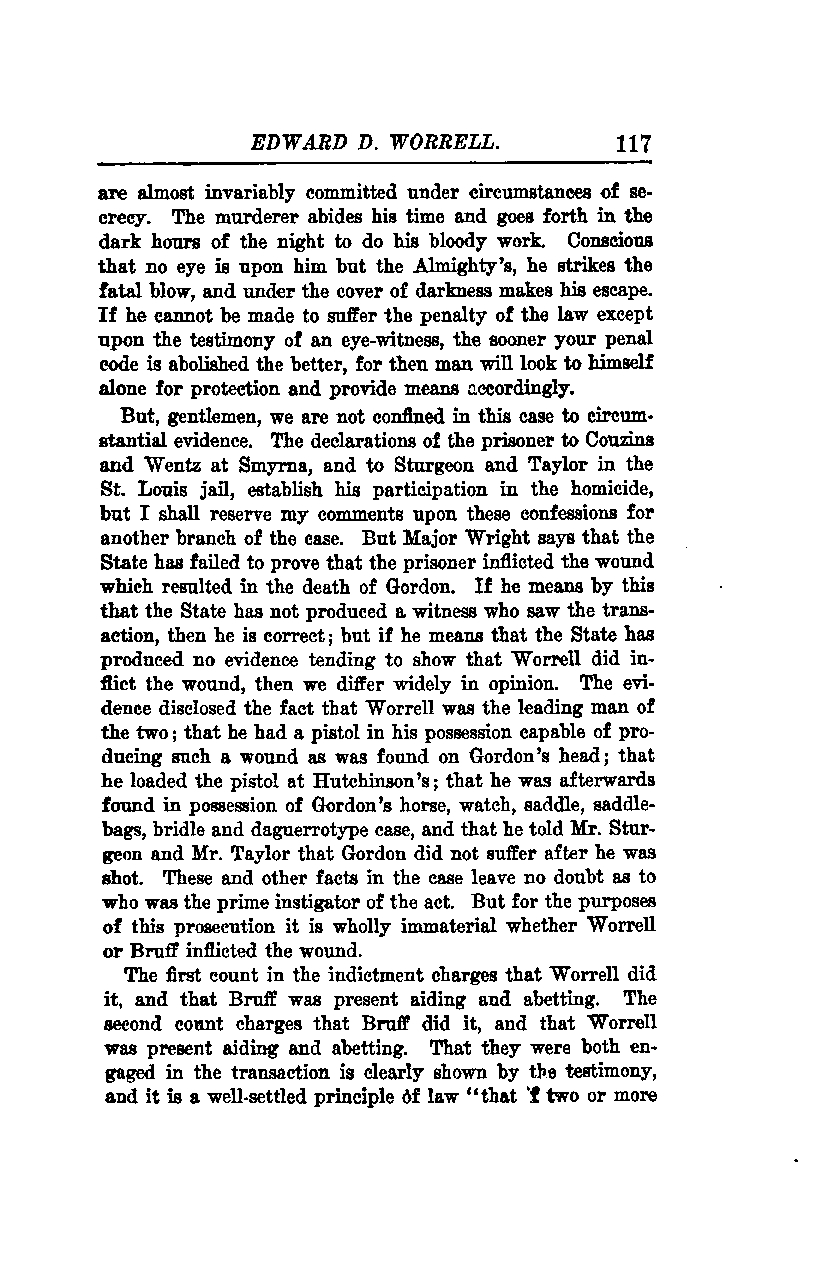 But, gentlemen, we are not confined in this case to circumstantial evidence. The declarations of the prisoner to Couzins and Wentz at Smyrna, and to Sturgeon and Taylor in the St. Louis jail, establish his participation in the homicide. However, I shall reserve my comments upon these confessions for another branch of the case. But Major Wright says that the State has failed to prove that the prisoner inflicted the wound which resulted in the death of Gordon. If he means by this that the State has not produced a witness who saw the transaction, then he is correct; but if he means that the State has produced no evidence tending to show that Worrell did inflict the wound, then we differ widely in opinion. The evidence disclosed the fact that Worrell was the leading man of the two; that he had a pistol in his possession capable of producing such a wound as was found on Gordon’s head; that he loaded the pistol at Hutchinson’s; that he was afterwards found in possession of Gordon’s horse, watch, saddle, saddlebags, bridle, and daguerreotype case, and that he told Mr. Sturgeon and Mr. Taylor that Gordon did not suffer after he was shot. These and other facts in the case leave no doubt as to who was the prime instigator of the act. But for the purposes of this prosecution, it is wholly immaterial whether Worrell or Broff inflicted the wound.