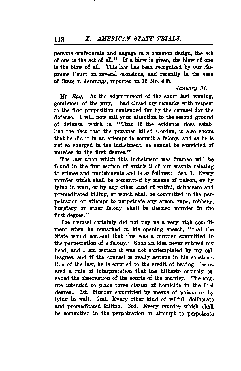 Mr. Bay: At the adjournment of the court last evening, gentlemen of the jury, I had closed my remarks with respect to the first proposition contended for by the counsel for the defense. I will now call your attention to the second ground of defense, which is, "That if the evidence does establish the fact that the prisoner killed Gordon, it also shows that he did it in an attempt to commit a felony, and as he is not so charged in the indictment, he cannot be convicted of murder in the first degree."
