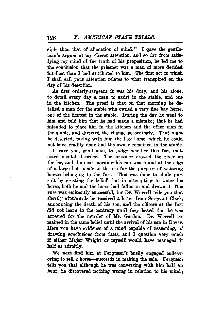 I leave you, gentlemen, to judge whether this fact indicated mental disorder. The prisoner crossed the river on the ice, and the next morning, his cap was found at the edge of a large hole made in the ice for the purpose of watering horses belonging to the fort. This was done to elude pursuit by creating the belief that in attempting to water his horse, both he and the horse had fallen in and drowned. This ruse was eminently successful, for Dr. Worrell tells you that shortly afterward, he received a letter from Sergeant Clark, announcing the death of his son, and the officers at the fort did not learn to the contrary until they heard that he was arrested for the murder of Mr. Gordon. Dr. Worrell remained in the same belief until the arrival of his son in Dover. Here you have evidence of a mind capable of reasoning, of drawing conclusions from facts, and I question very much if either Major Wright or myself would have managed it half as adroitly.
