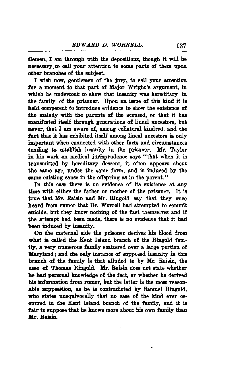 On the maternal side, the prisoner derives his blood from what is called the Kent Island branch of the Ringold family, a very numerous family scattered over a large portion of Maryland. The only instance of supposed insanity in this branch of the family is that alluded to by Mr. Raisin, the case of Thomas Ringold. Mr. Raisin does not state whether he had personal knowledge of the fact, or whether he derived his information from rumor, but the latter is the most reasonable supposition, as he is contradicted by Samuel Ringold, who states unequivocally that no case of the kind ever occurred in the Kent Island branch of the family, and it is fair to suppose that he knows more about his own family than anyone else.