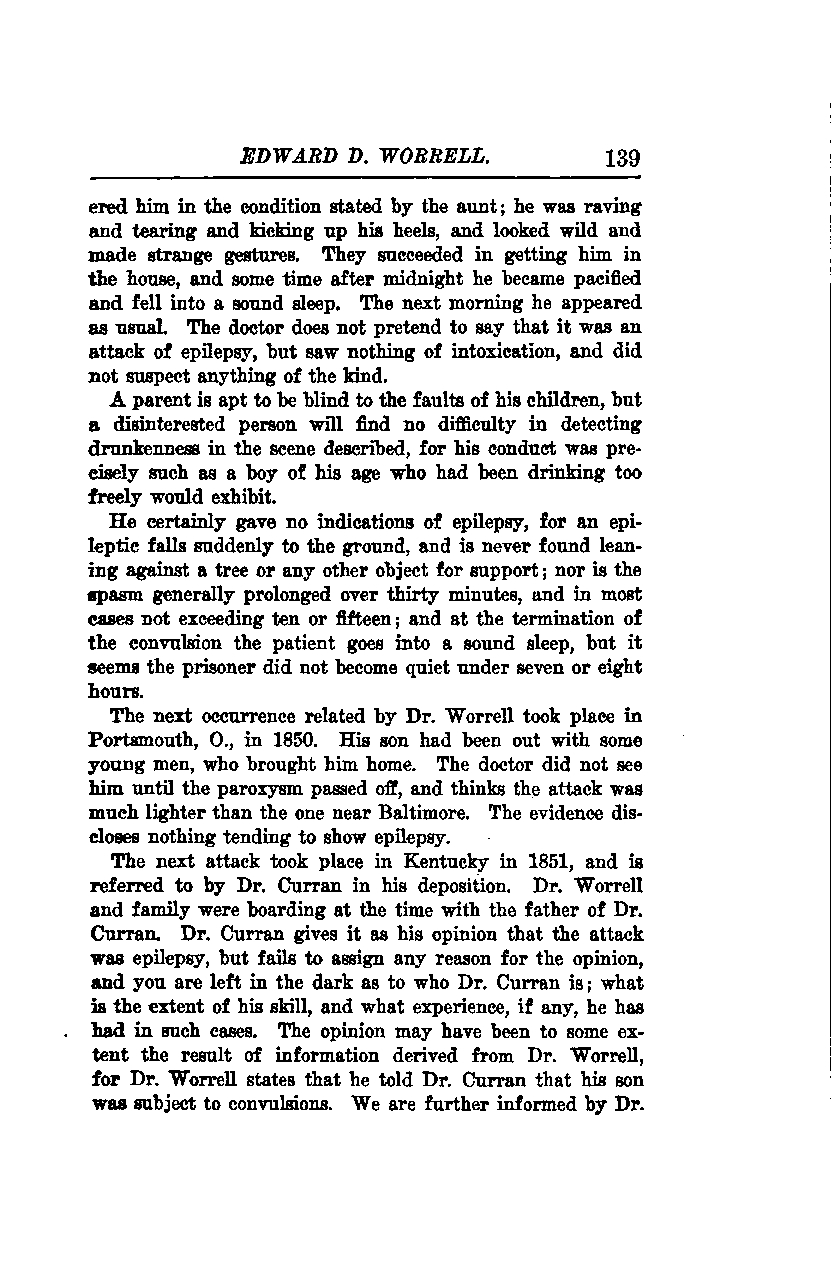 The next occurrence related by Dr. Worrell took place in Portsmouth, Ohio, in 1850. His son had been out with some young men, who brought him home. The doctor did not see him until the paroxysm passed off, and thinks the attack was much lighter than the one near Baltimore. The evidence discloses nothing tending to show epilepsy.